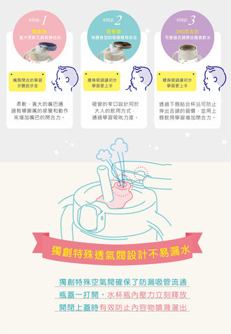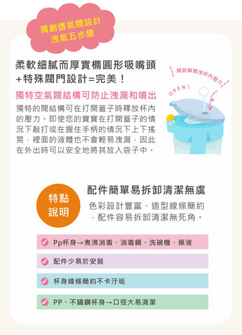 🔸按鈕式吸管蓋,開關簡單,方便外出使用🔸柔軟的吸管,令BB👶🏻容易吸啜🔸透明杯身,可清楚👀看到寶寶啜飲時的速度及杯內飲品容量🔸有刻度設計,可沖奶使用🍼🔸握把的設計,適合寶寶的小手拿握💁🏻♀🔸不含雙酚A(BPA),安心使用⭕